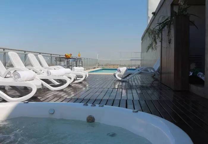 På byggnadens tak kan du ta dig en simtur i den lilla, uppvärmda poolen och koppla av i jacuzzin med en drink i handen och en fantastisk utsikt över staden.