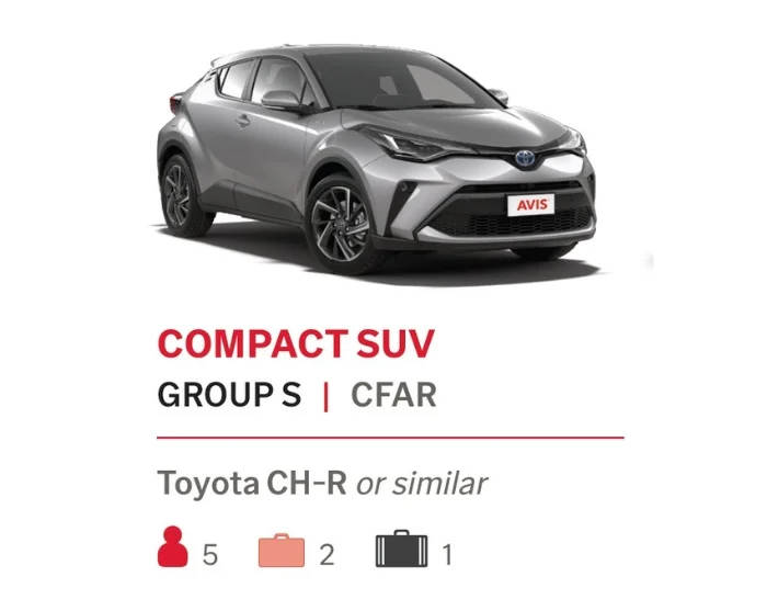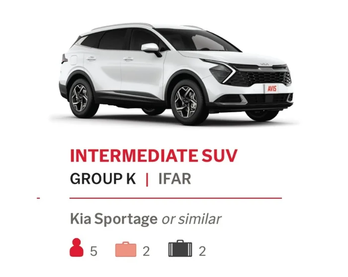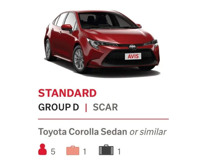 Vi använder AVIS som biluthyrningsfirma i Australien. Som standard ingår en kategori D – ”standard” Toyota Corolla Sedan eller liknande – i din bilhyra, vilket passar för 1–3 personer med bagage. Det är möjligt att uppgradera till andra kategorier och modeller om ni är fler som reser tillsammans eller om du helt enkelt önskar en större hyrbil.