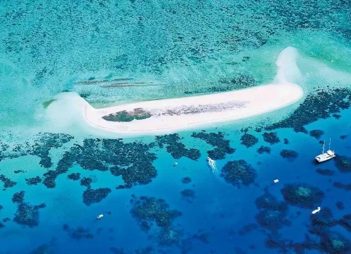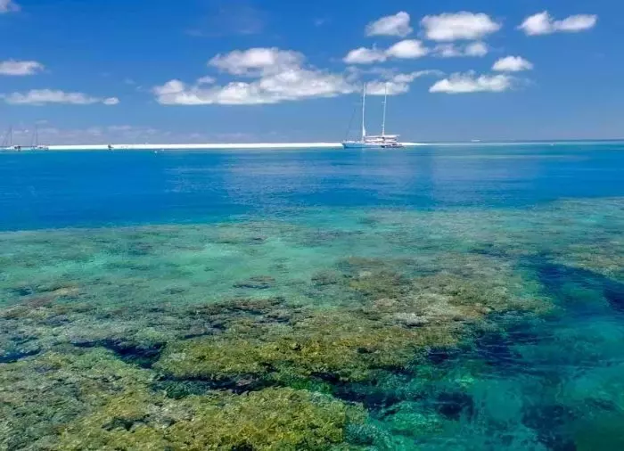 Båten du seglar med är en drygt 100 fot lång, lyxig katamaran och dagens resmål är en sandbank på det yttre revet, Michaelmas Cay.
