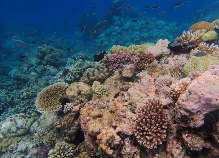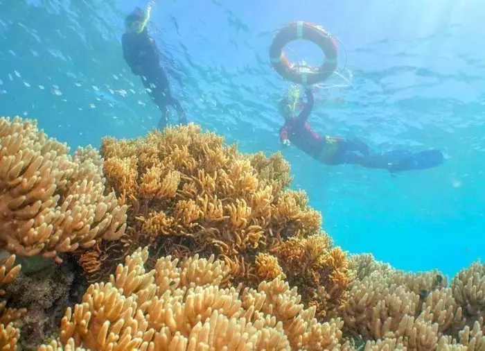 Du kan välja att snorkla direkt från båten eller att ta dig över till sandbanken och snorkla därifrån. En liten båt går regelbundet mellan katamaranen och sandbanken hela dagen så att du kan ta dig fram och tillbaka.