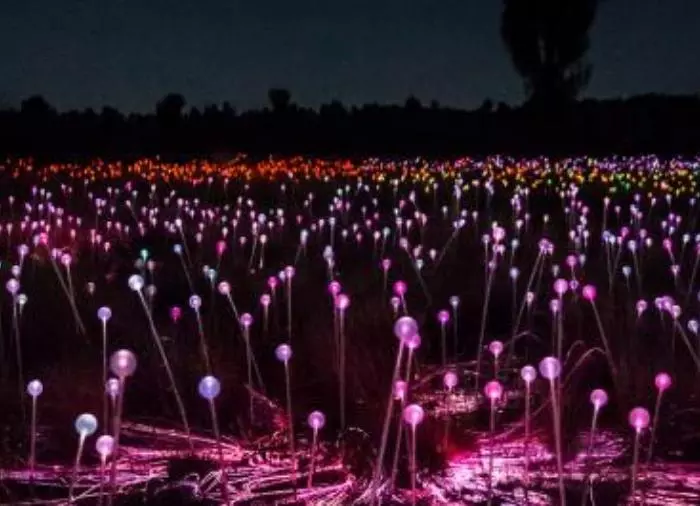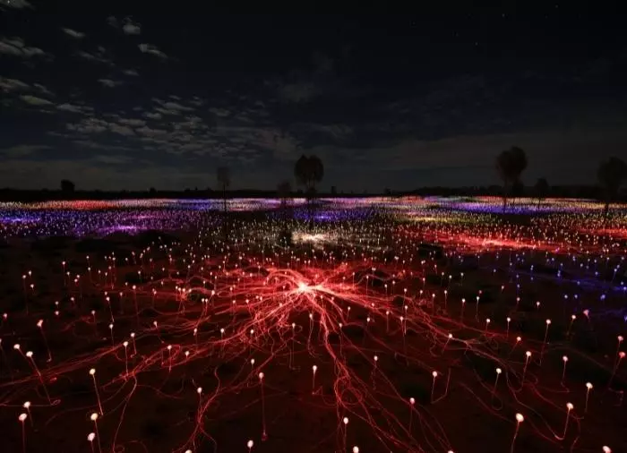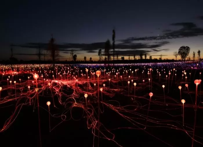 Vad är då Field of Light, undrar du kanske? Föreställ dig 50 000 solcellsstänger och -lampor som täcker ett område på 62 500 kvadratmeter, eller ungefär tio fotbollsplaner. I dagsljus är det inte så imponerande, men när solen går ner och de små lamporna tänds en efter en i mörkret som långsamt sänker sig över Uluru, ja, då har du Field of Light. Installationen är skapad av den australiska konstnären Bruce Monroe, som påstås ha bevittnat ett riktigt blomsterhav under sitt första besök vid Uluru. När han återvände nästa gång hade regnet uteblivit och blommorna försvunnit. Endast den torra australiska öknen stod kvar. Hans tanke med installationen var att återskapa det vackra blomsterhav han hade sett på sitt första besök. Bedöm själv om han lyckades.