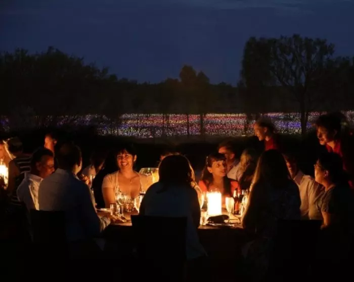 Kvällen startar med ett glas skumpa i solnedgången medan lamporna tänds en efter en. Det är alltid lite vemodigt att se solen försvinna bakom Uluru, men i dag väntar en belöning efter solnedgången. Njut av en trerätters middag som serveras som buffé innan du tar en promenad i Fields of Light. Observera att vi äter vid stora bord med cirka 10 gäster vid varje bord.