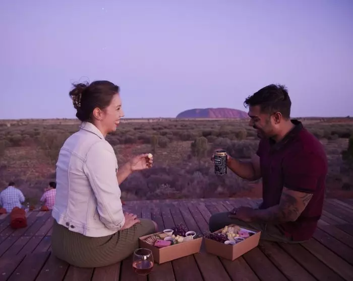 Med australiskt vin i glaset och en läcker, lätt måltid på tallriken kan du luta dig tillbaka och njuta av den imponerande uppvisningen som är på väg att börja. En kombination av drönare och laserljus ger tillsammans liv åt historien om det gamla malafolket i en modern berättelse under den stjärnklara himlen. Medan du lyssnar på traditionell dansmusik och berättelser på pitjantjatjara kan du känna en djup samhörighet med det australiska landskapet och dess rika kulturella arv. Det är en upplevelse som är svår att beskriva, men som gör ett stort intryck.