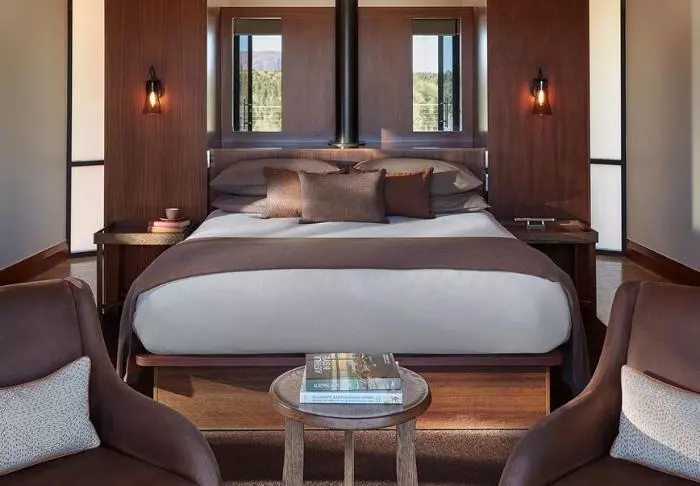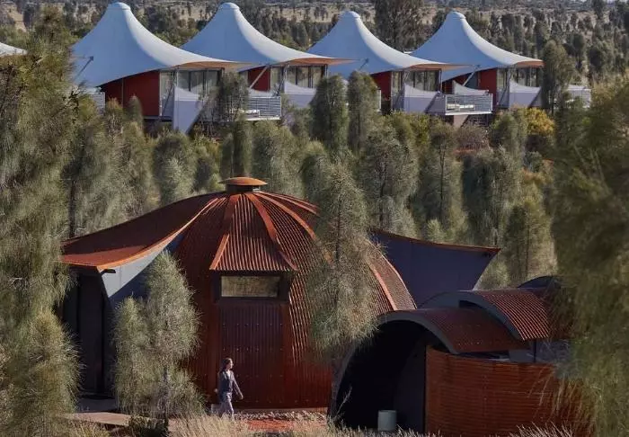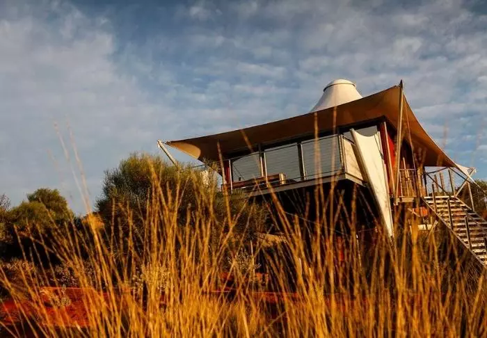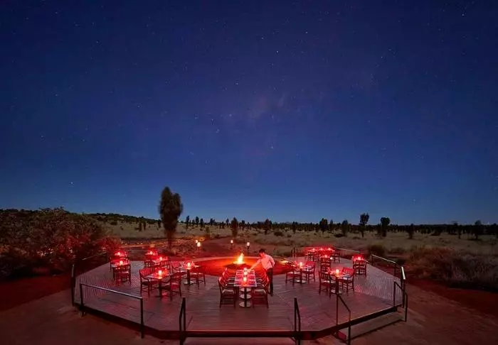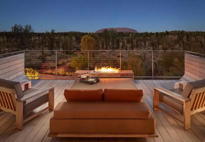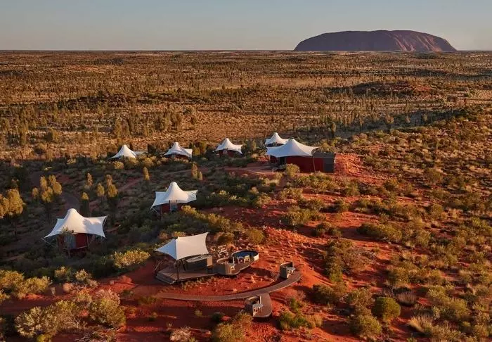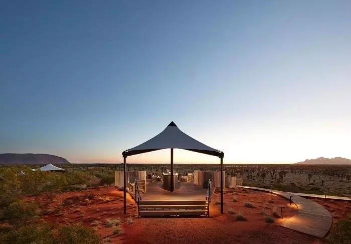 Tält är kanske inte rätt ord. Här finns fönster från golv till tak med ostörd utsikt över Uluru, medan taket är gjort av kanvas så att du fortfarande kan känna doften av naturen och höra ljuden utanför. Semi-tälten är rymliga och otroligt smakfullt inredda, och de har naturligtvis alla tänkbara förnödenheter – bland annat fjärrstyrda gardiner så att du inte ens behöver lämna sängen på morgenen för att se om solen har stått upp över Uluru. Alla 15 tält har en egen stor veranda med dagbädd, där du kan dåsa med utsikt över monoliten – eller tillbringa natten under stjärnorna.