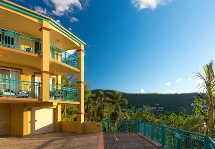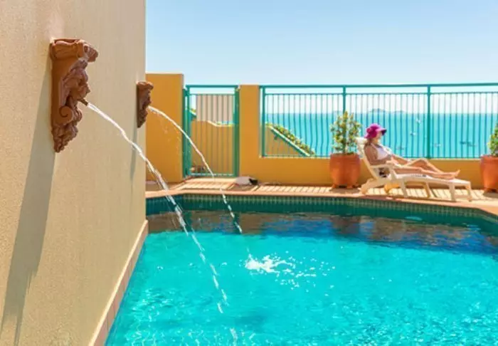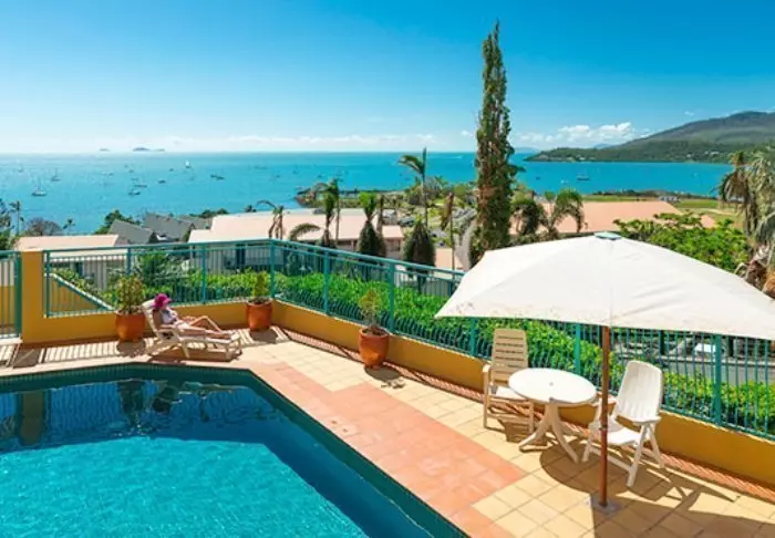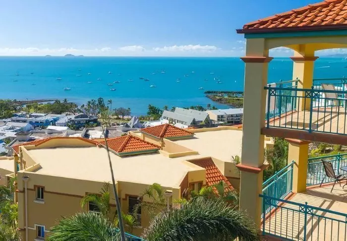 Toscana Village Resort har ett fantastiskt läge på en liten höjd med panoramautsikt över staden och Korallhavet med Whitsundayöarna i bakgrunden.
