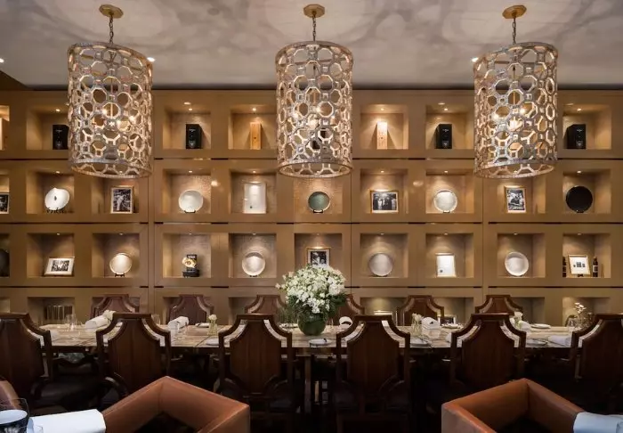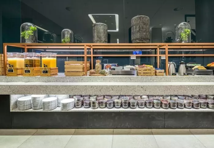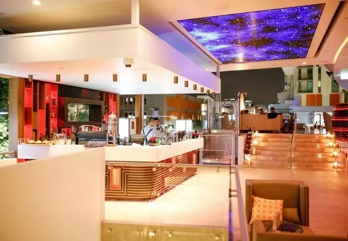 Restaurangen ligger på bottenplan, medan poolen ligger på tredje våningen under delvis öppen himmel.