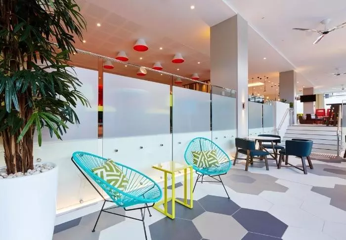 Hotellet omges av restauranger, barer och butiker medan stadens gågata ligger en kvarts promenad söderut.