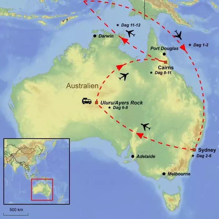 På denna resa upplever du Australiens absolut största höjdpunkter. Från en av världens mest vackert belägna städer, Sydney, reser du till den öde öknen med Uluru som (bokstavligt talat) mittpunkt. Här ser du solen gå ner och upp över Uluru och deltar i en vandringstur vid Kata Tjuta.