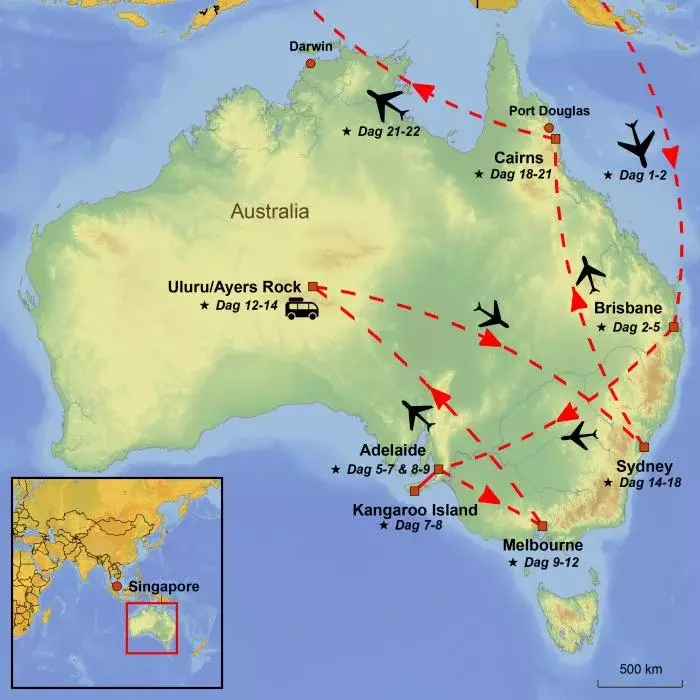 • Inrikesflyg från Brisbane till Adelaide + Adelaide till Melbourne + Melbourne till Uluru/Ayers Rock + Uluru/Ayers Rock till Sydney + Sydney till Cairns
