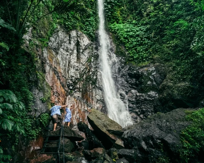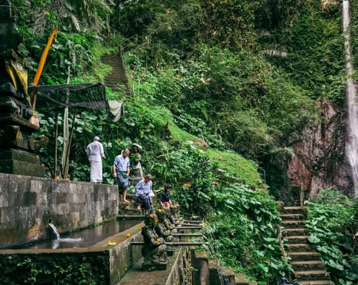 Därefter går turen vidare mot vattenfallet Jagasatru. Du körs till en närliggande parkeringsplats, varifrån det är en kort vandring på cirka 300 meter ner till vattenfallet. I de rofyllda, gröna omgivningarna deltar du i en traditionell reningsceremoni, där vattnets rörelse och naturens ljud skapar utrymme för lugn och eftertanke. Ceremonin ger en inblick i balinesernas andliga utövning och deras nära relation till naturen.