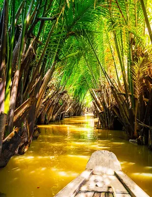 Upplev den frodiga naturen från vattensidan under en segeltur i skuggan av de gröna kokospalmerna i deltats frodiga nätverk av vattenvägar, t.ex. i en traditionell sampan – en flatbottnad träbåt. Under en segeltur kan du uppleva hur en stor del av transporten och livet på vattnet försiggår.