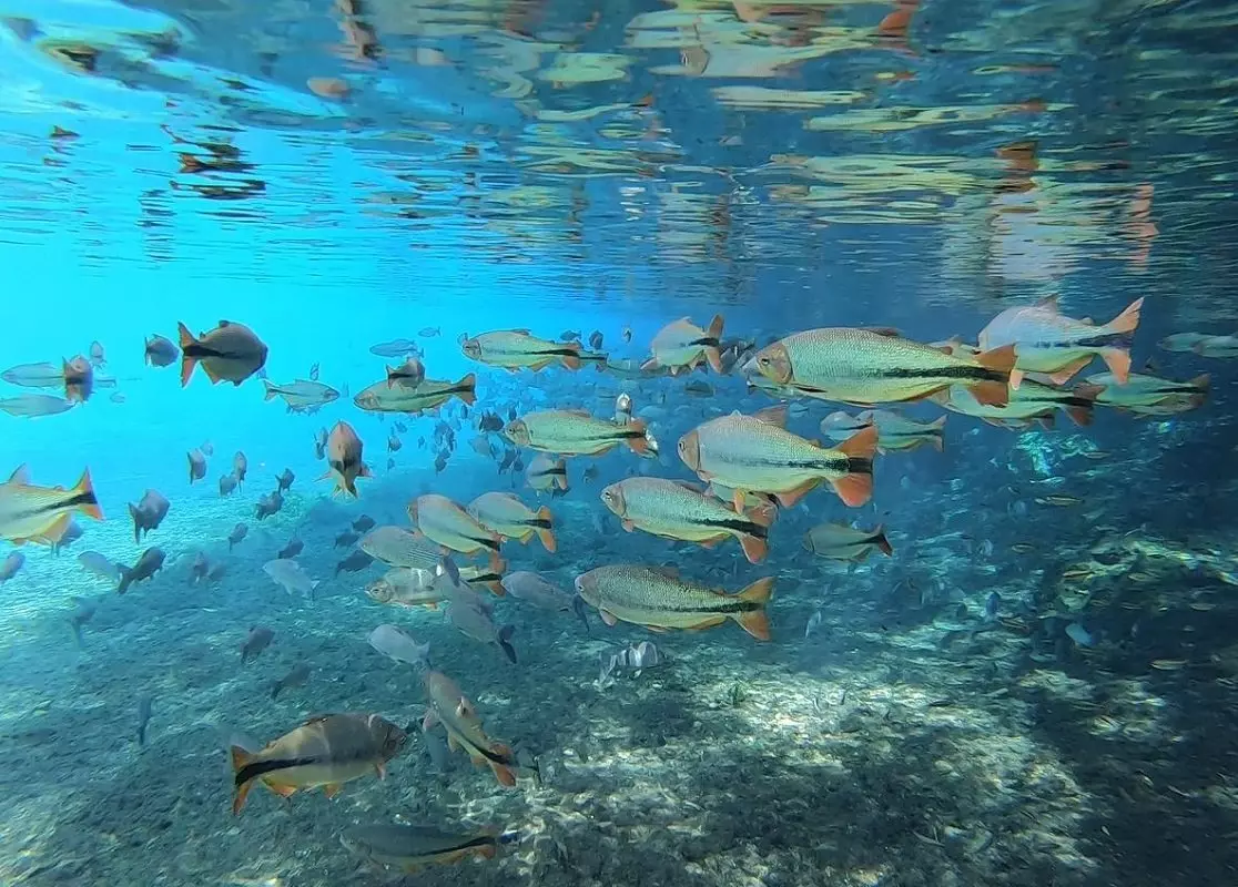 I Bonito väntar en snorkeltur i kristallklara floder bland färgglada fiskar och vattenväxter samt ett besök i det stora zinkhålet, Buraca das Araras, där de mörkröda papegojorna (Ara chloropterus) lever och bygger bon i bergssprickorna.