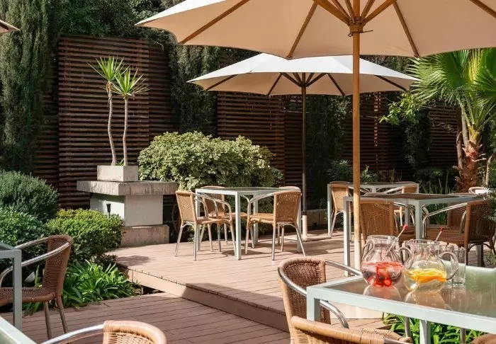 Hotellet har en egen restaurang och ett loungeområde med en trevlig terrass.