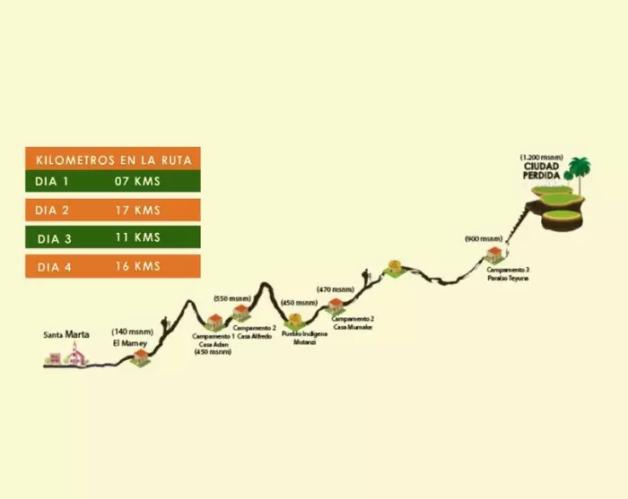 Denna dag är den mest krävande på vandringen. Det är flera utmanande upp- och nedstigningar och du kommer också att korsa floden Buritaca flera gånger. Lunchen serveras vid ett läger längs vägen, och det finns även snacks och färsk frukt för att ge dig tillräcklig energi under turen.
