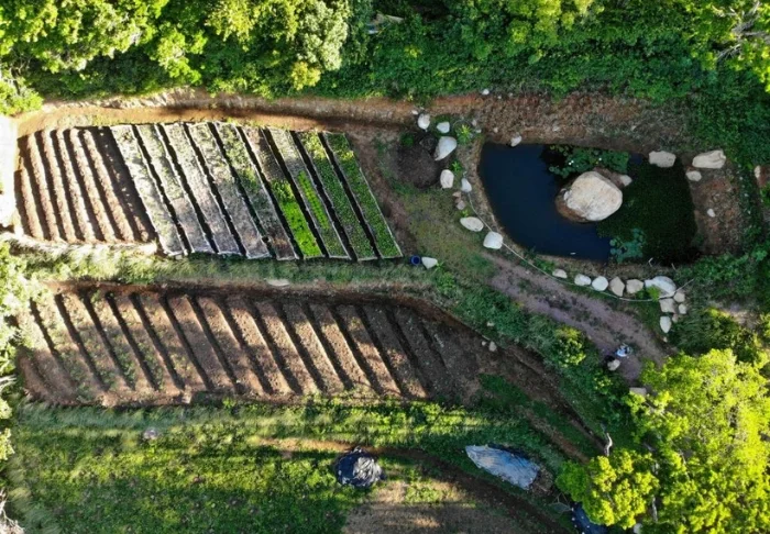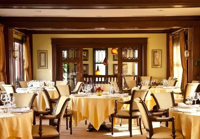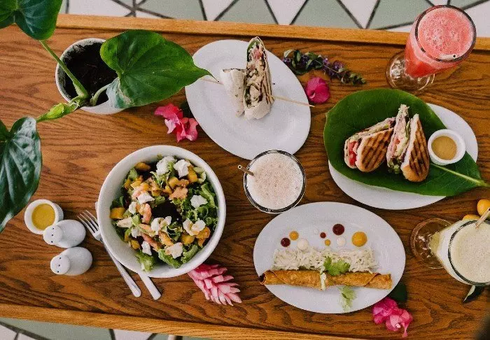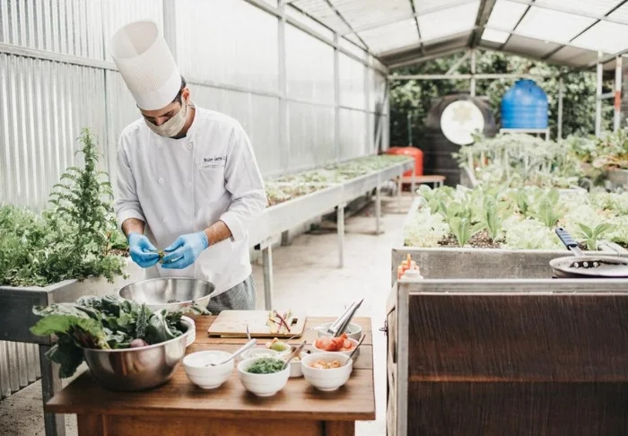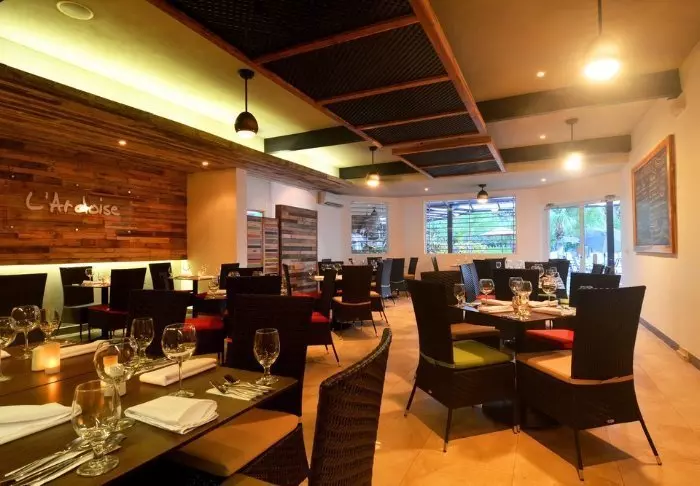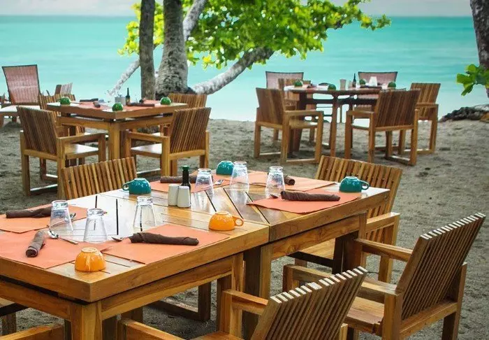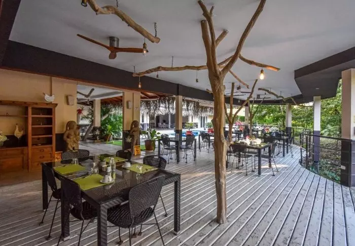 Resortens egen restaurang serverar en kombination av lokala och internationella rätter, där många av ingredienserna har odlats i den egna köksträdgården.