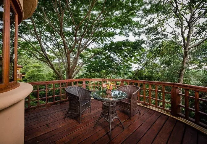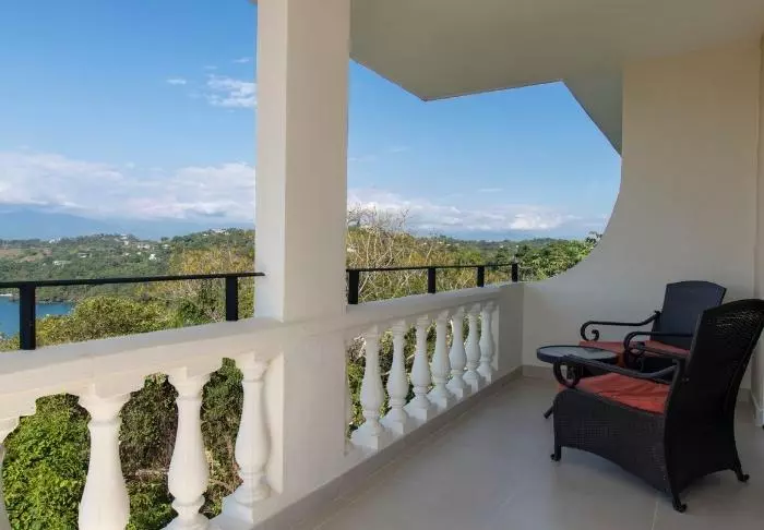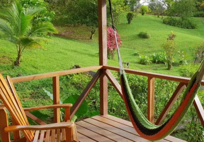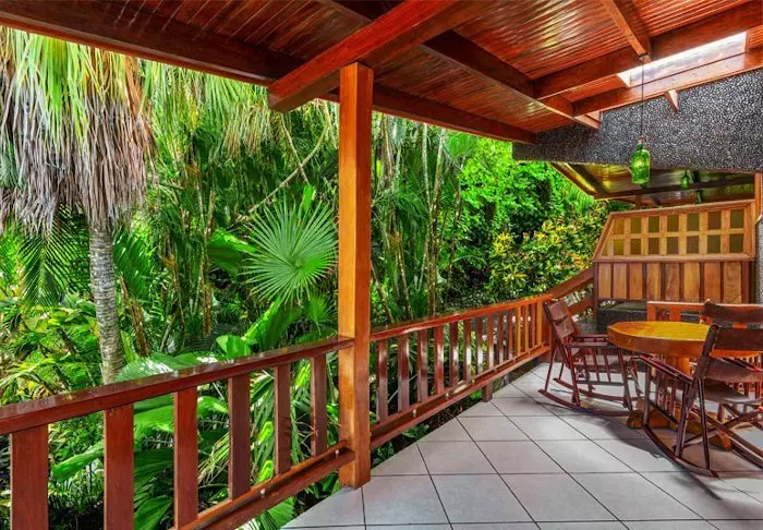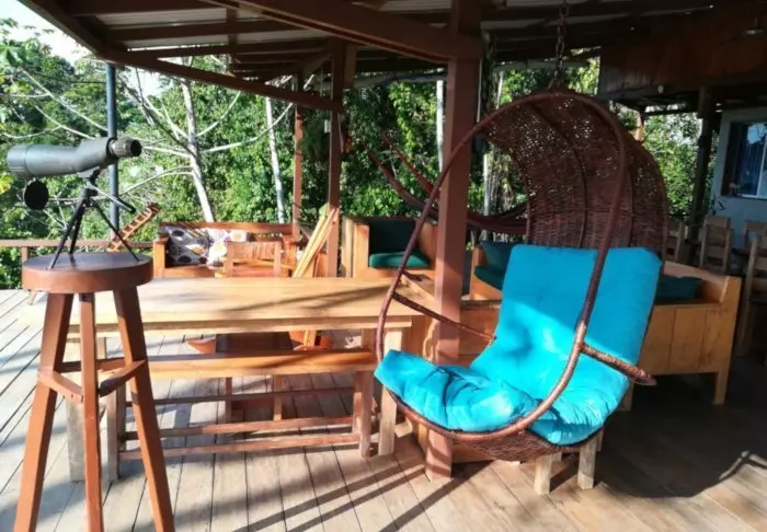 Från verandan kan du koppla av och njuta av utsikten över bukten och djungeln.