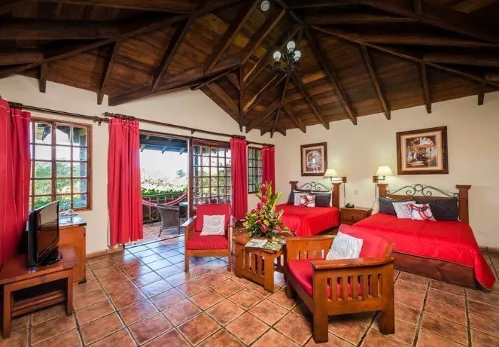 Lodgens 28 rum är inredda med olika färgteman och utsmyckade med folkkonst, som harmonierar fint med naturen kring lodgen. Varje rum har eget badrum med hårtork, toalettartiklar och dusch med varmt vatten. Samtliga rum erbjuder en utsikt över antingen vulkanen eller dalen i Turrialba.