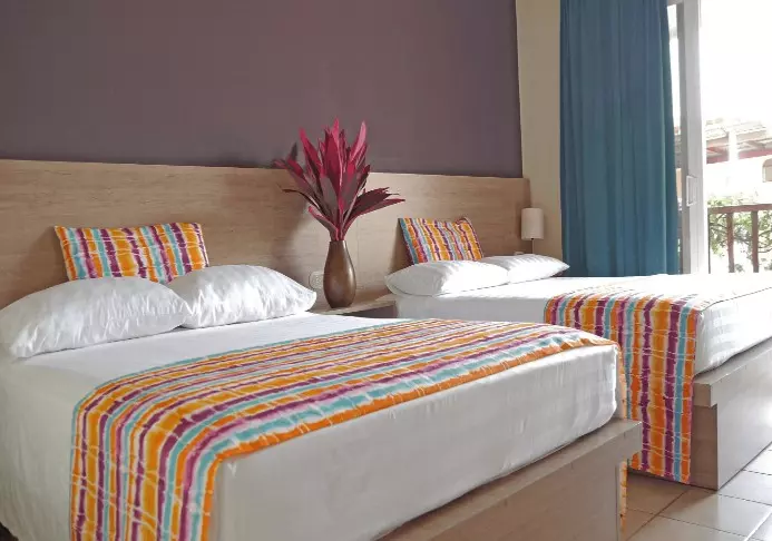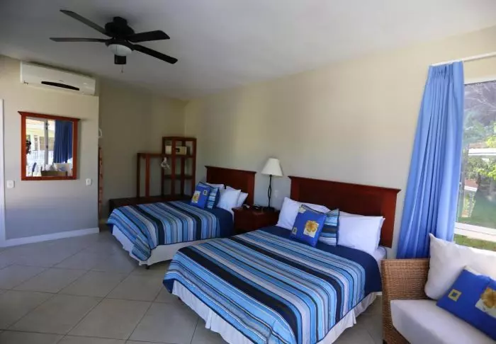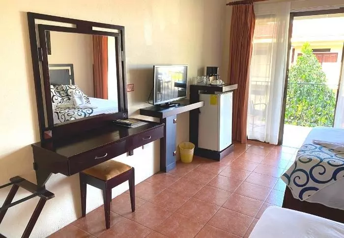 Hotellet är i två våningar och har endast 24 rum, som alla har privat terrass eller balkong med utsikt över den frodiga trädgården eller en av de två små poolerna. Rummen är mycket färgrika och av lite äldre karaktär, men här finns allt du behöver såsom tv, takfläkt, aircondition, kylskåp, värdeskåp och egen toalett.