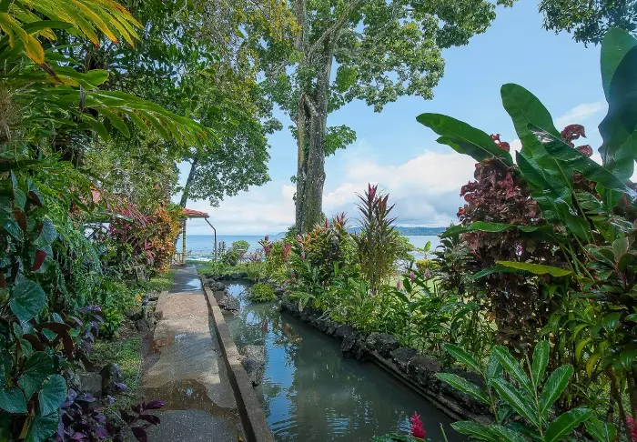 Från hotellet kan du följa en liten stig längs vattnet som leder in till själva Drake Bay. Promenaden tar cirka 10–15 minuter till fots och går genom grönskande omgivningar, vilket ger en vacker och genuin känsla för området – både kustlinjen, byn och den avslappnade lokala livsstilen.
