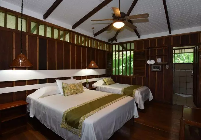 Lodgen strävar efter att skapa en upplevelse så nära naturen som möjligt och därför finns det varken tv, radio eller aircondition på rummen. De 56 rustika rummen är byggda i en traditionell karibisk stil med mörkt trä, som smälter in naturligt i de gröna omgivningarna. Varje rum har ett eget badrum utrustat med hårtork och toalettartiklar. Takfläkt och nät för fönstren erbjuder en naturlig bris och ger dig möjlighet att lyssna till regnskogens ljud medan du faller i sömn.