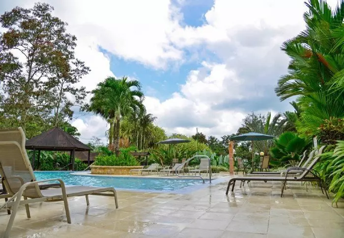 Hotellet har ett fint poolområde med liggstolar där du kan koppla av, njuta de grönskande omgivningarna och lyssna på skogens många ljud.