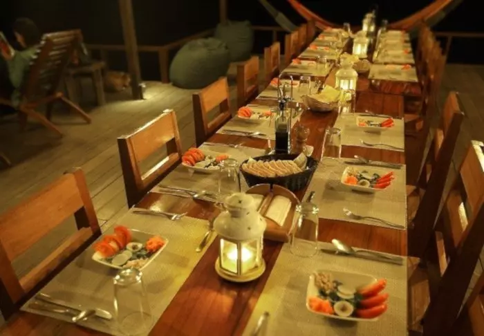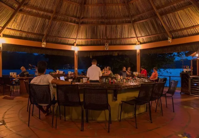 Du kan också njuta av omgivningarna från loungeområdet och restaurangen på den stora takförsedda verandaen, där frukost (inkluderad), lunch och kvällsmat serveras. Kvällsmaten är en upplevelse i sig – på menyn står flera rätter som du äter tillsammans med de andra gästerna kring ett stort bord med gott om möjligheter att prata om dagens upplevelser med varandra. Observera att kvällsmaten bokas under frukosten och inte ingår.