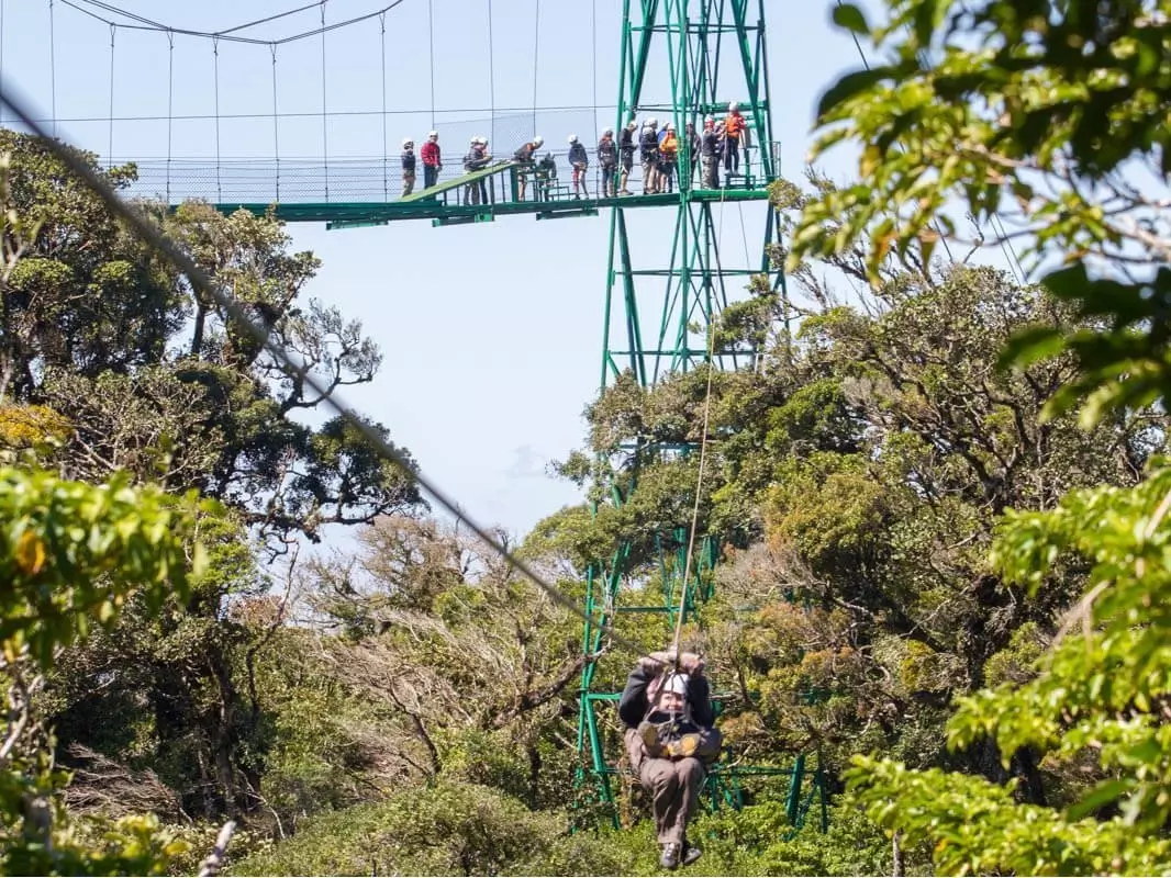 Här väntar dig en spännande vandringstur på ca 2,5 kilometer bland trädtopparna! Medan du går på hängbroar mellan träden får du uppleva den unika och mystiska stämningen som dimman ger detta förtrollande landskap. Du är omgiven av orkidéer, ormbunkar, mossa, enorma träd och otaliga växtarter som växer på trädens stammar. Från den trolska skogens trädtoppar kvittrar färggranna fåglar som gyllenbruna organist, kopparspräcklig smaragd, quetzal och mer än 400 andra fågelarter, som gör skogen till ett rent paradis för fågelintresserade.