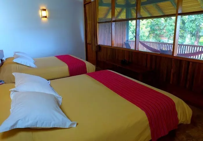 Lodgen har 76 rymliga, rustika rum som alla har fläkt, privat badrum och egen terrass med en hängmatta där du kan koppla av och njuta av de frodiga omgivningarna. Det är endast myggnät för fönstren så du får en naturlig bris i rummet och samtidigt kan du lyssna till djungelns ljud och den brusande floden. På natten rekommenderar vi dock att du använder öronproppar eftersom regnskogens ljud kan låta högre än man tror.
