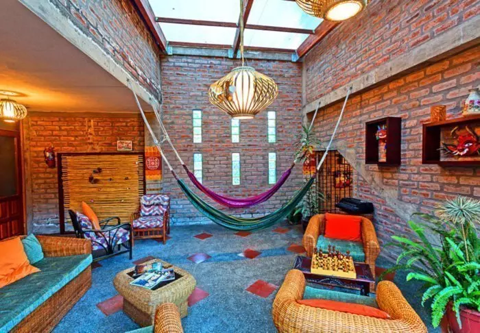 Det färgglada hotellet är i två våningar och har 29 rum som ligger runt den frodiga trädgården. Här finns många trevliga gemensamma områden där du kan koppla av i en hängmatta och prata med andra resande.