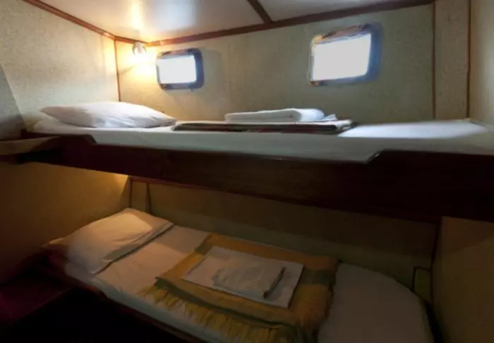 Båten har endast 8 hytter med plats för 16 passagerare fördelat på 3 däck. Hytterna har små kojer men alla har egen toalett och luftkonditionering. Vi använder de hytter som ligger på mellersta och övre däck, där det är minst motorljud.