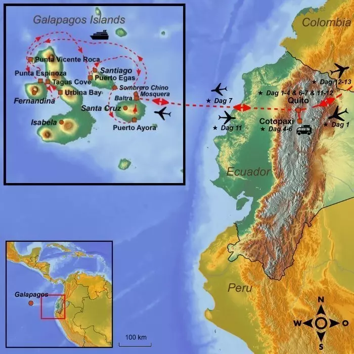 Efter besöket blir du körd i buss över ön till Itabaca-kanalen och överfarten till flygplatsön Baltra, varifrån du flyger tillbaka till Quito på Ecuadors fastland. Flygresan tillbaka till Quito tar ofta lite längre tid (ca 2,5-4 timmar), eftersom det vanligtvis är en kort mellanlandning i Guayaquil.
