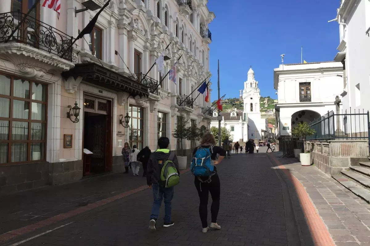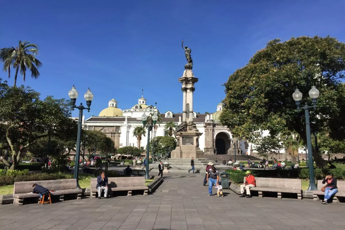 Stadsvandringen börjar med ett besök vid Plaza de la Independencia (”Självständighetstorget”), som omges av fyra viktiga byggnader: presidentens palats, regeringsbyggnaden, ärkebiskopens palats och Quitos katedral.