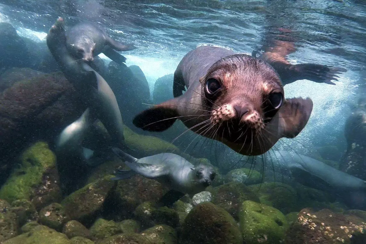 Du äter lunch på båten och sedan är det dags att snorkla i det klara vattnet, där vackra färgrika fiskar väntar. En av dagens absoluta höjdpunkter är att simma tillsammans med de nyfikna och lekfulla sjölejonen.