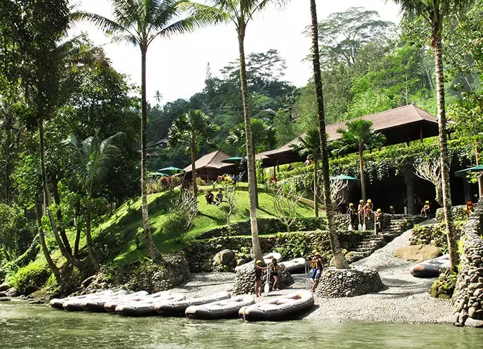 En brant stig och trappsteg leder ner till Ayungfloden, där du instrueras i hur forsränningen går till och hur du i övrigt ska förhålla dig på båten, som har plats för 6 personer plus en certifierad guide. Ombord finns en vattentät väska där du kan lägga din mobiltelefon, din plånbok osv.