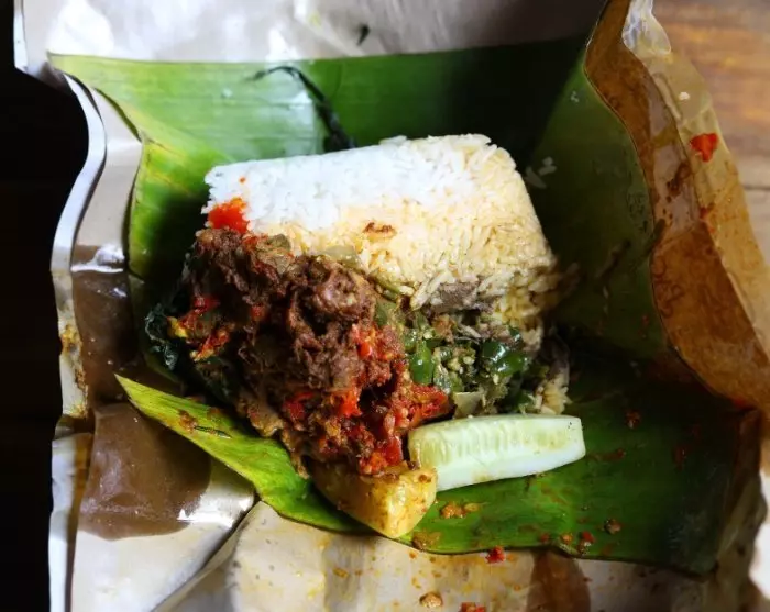 Cykelturen avslutas vid en liten paviljong vid stranden, där du kan njuta av rätten ”Nasi Bungkus”. Detta är en traditionell rätt som består av ris och kött och som många i lokalbefolkningen tar med sig när de är på språng.