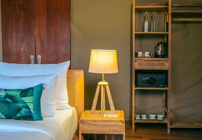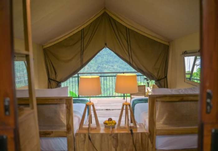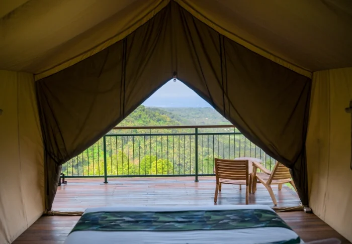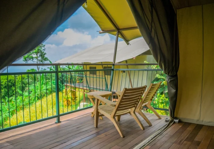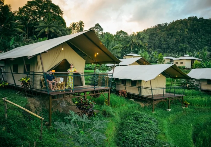 Resorten består av 22 fristående paviljonger som ligger på små terrasser med utsikt över antingen dalen eller havet. Inredningen är ljus och enkel med naturliga material som trä och vävda textilier. När tältduken dras åt sidan öppnar sig rummet mot naturen och du kliver rakt ut på din egen terrass med känslan av att stå mitt i landskapet. Som standard bor du i en paviljong för 2 personer med 25 m² inomhusyta och en terrass på 10 m². Samtliga paviljonger har aircondition, wifi, värdeskåp och ett badrum med toalett, dusch, varmvatten och lokalt tillverkade badprodukter.