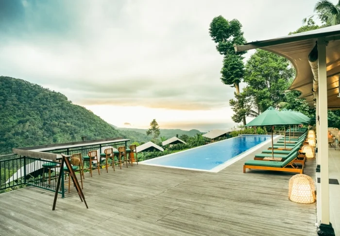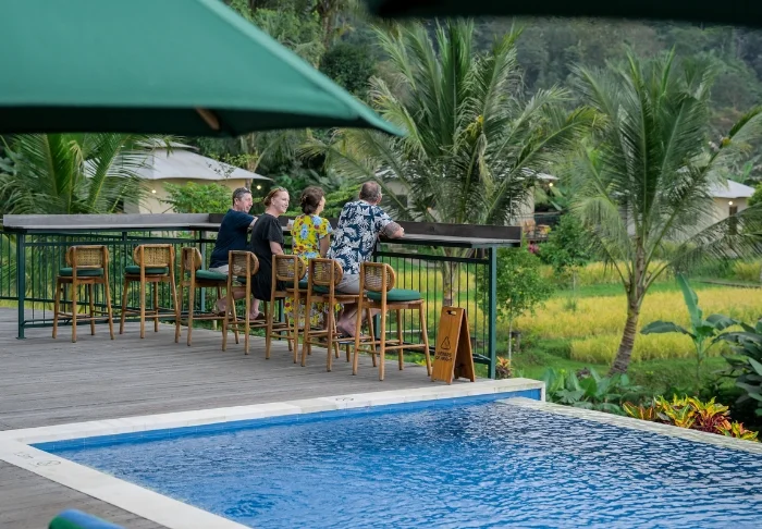 Hotellet har en härlig solterrass med solstolar, pool och en mindre barnpool. Här kan du koppla av och ladda batterierna medan du beundrar utsikten över risfälten, de höga palmerna, tropiska träd och växter.