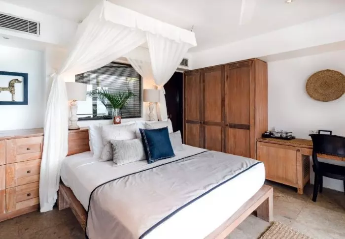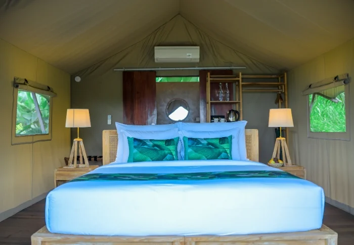Hotellet består av 18 privata bungalower byggda i tropisk stil av hållbara och naturliga material. Samtliga bungalower har elegant himmelssäng med myggnät, wifi, aircondition, minibar, te- och kaffefaciliteter samt delvist öppet badrum med dusch, morgonrock och hårtork. På verandan kan du koppla av med en god bok och njuta av den stilla brisen.
