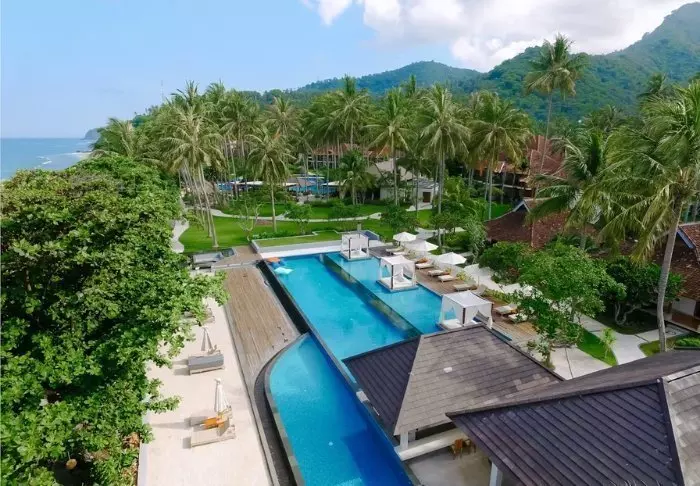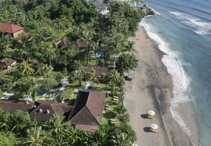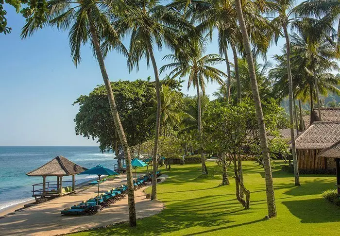 Resorten ligger direkt vid en härlig strand som inbjuder till avkoppling. Stranden har en mjuk, gyllene sand och stilla, klart vatten, perfekt för ett dopp eller snorkling. De omgivande palmerna och utsikten över havet skapar en tropisk, fridfull atmosfär där du kan njuta av solens strålar eller finna skugga under en parasoll. Stranden är dessutom en idealisk plats för att uppleva de magiska solnedgångarna över Lombok-sundet, som målar himlen i varma färger.