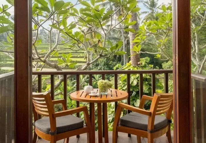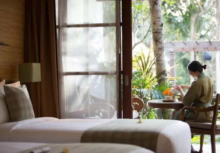 Rummen är rymliga och vackert inredda i ljusa naturmaterial med privat balkong, som vetter mot bergen, risfälten och floden. Alla rum har wifi, aircondition, minibar, värdeskåp, te- och kaffefaciliteter samt myggnät över sängen. Badrummet har badkar och här hittar du även morgonrock, tofflor, toalettartiklar och hårtork. För att göra din vistelse extra behaglig serveras det dagligen två flaskor vatten och färsk tropisk frukt.