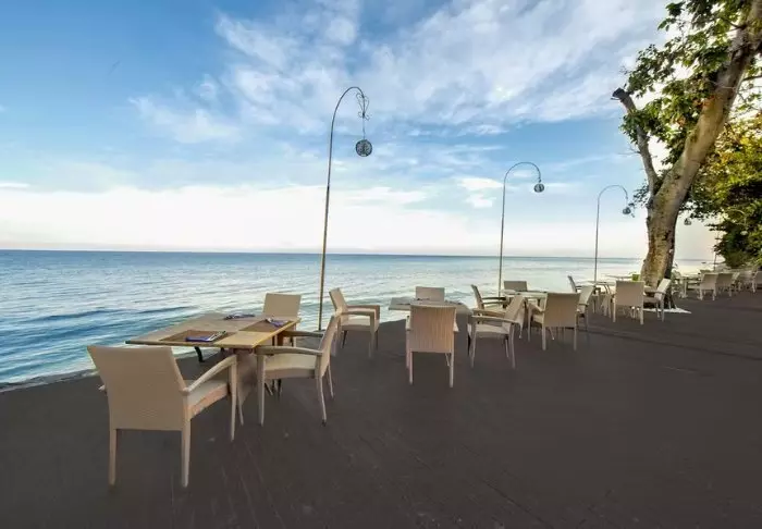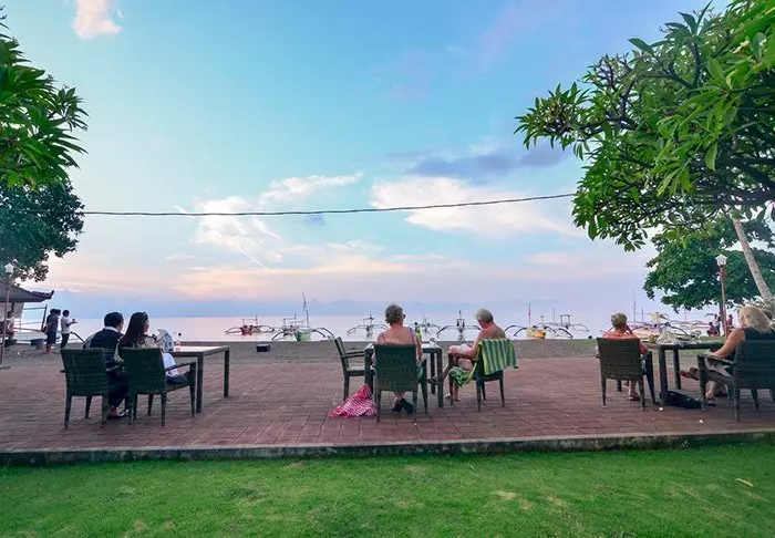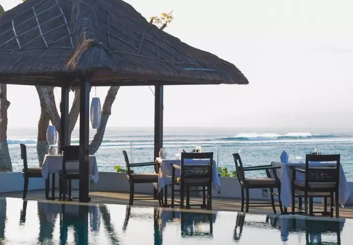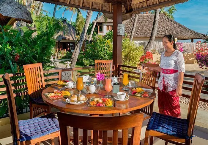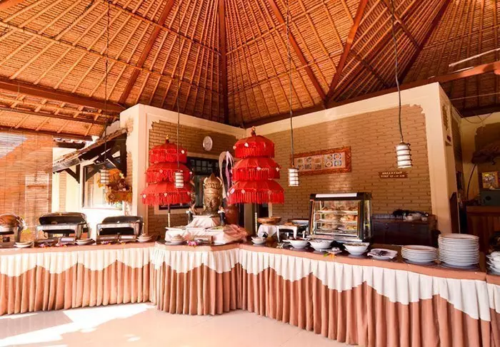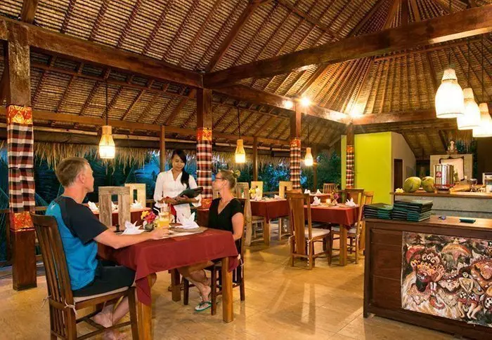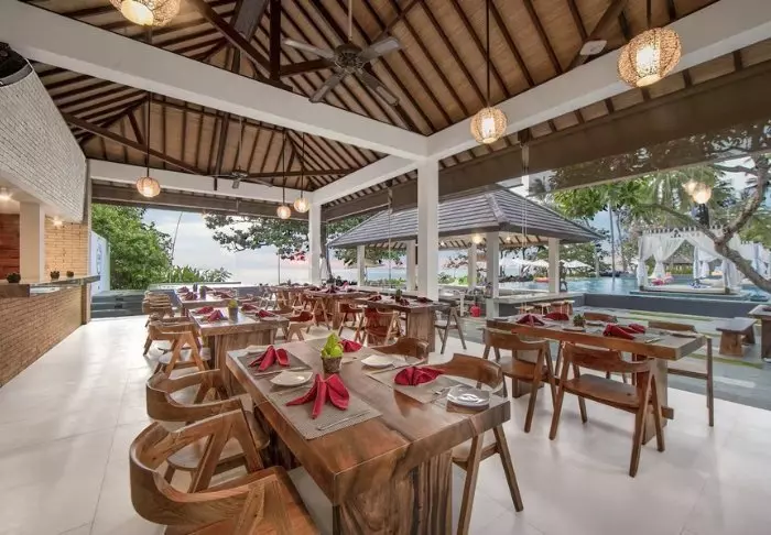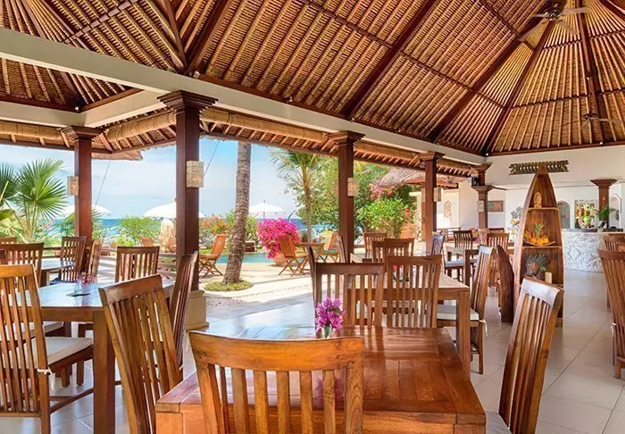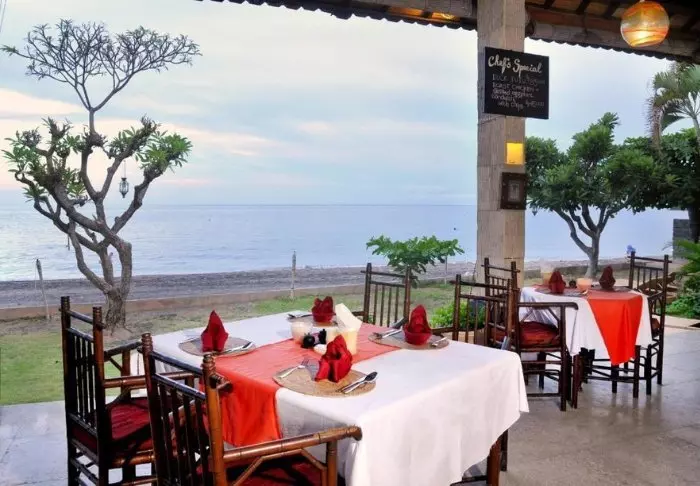 I restaurangen är en grupp lokalbor från den närliggande byn beredda att servera balinesiska och indonesiska rätter gjorda på lokala råvaror och färsk fisk, som levereras av de lokala fiskarna. Här svalkas du av en härlig bris från havet och har en vacker utsikt över stranden.