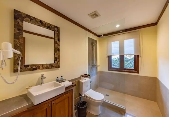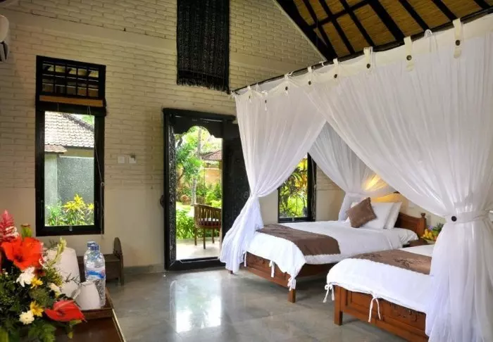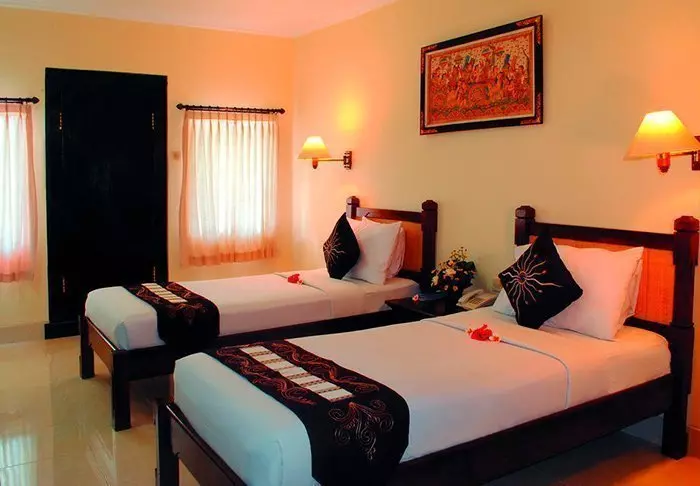 Hotellets rum är enkelt inredda i balinesisk stil och utrustade med gratis wifi, aircondition, minibar, tv, telefon, kaffe- och tefaciliteter samt badrum med gratis toalettartiklar. På din privata balkong eller terrass kan du koppla av och njuta av trädgårdens lugn och ro.