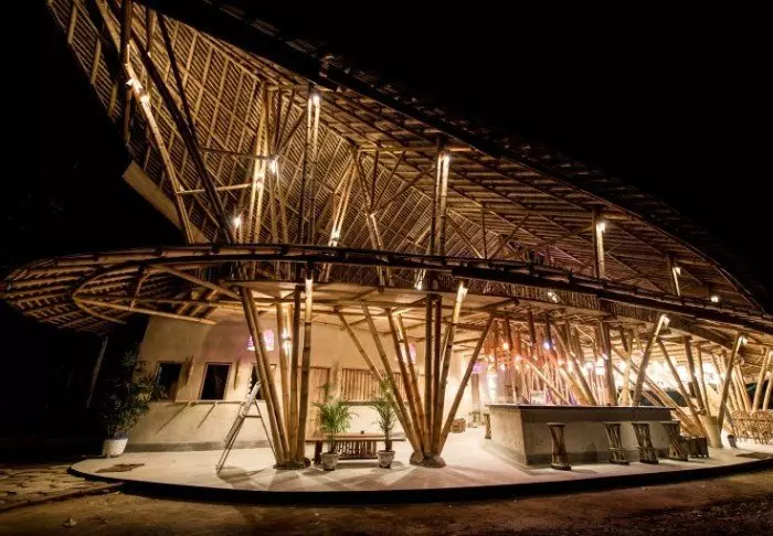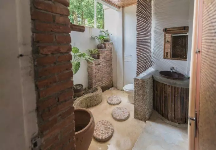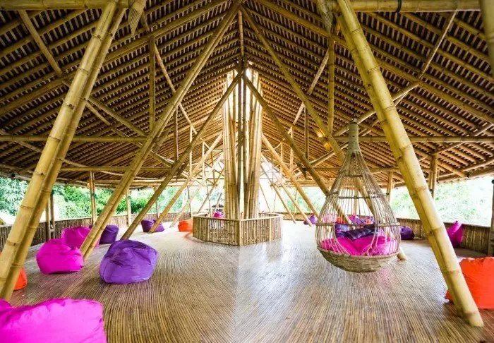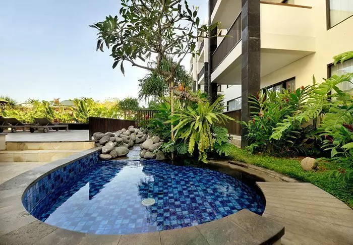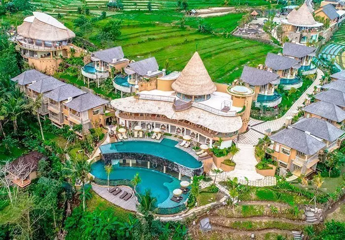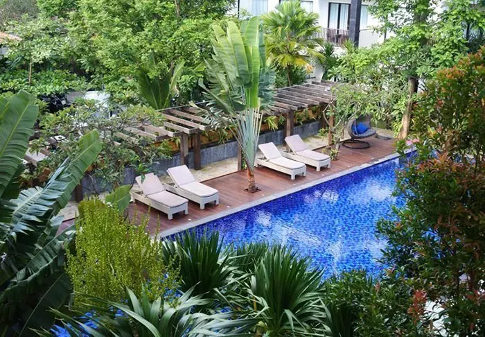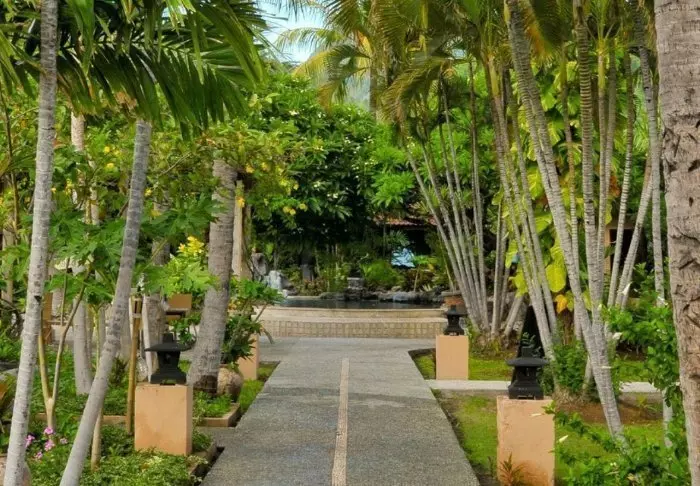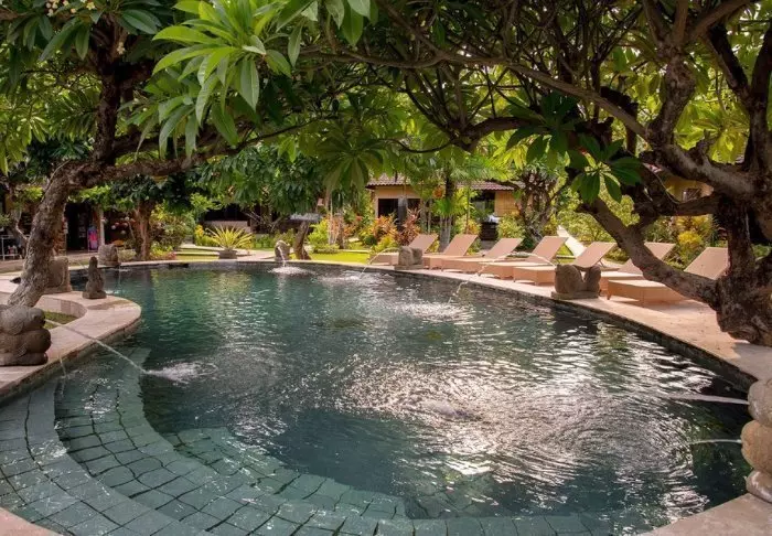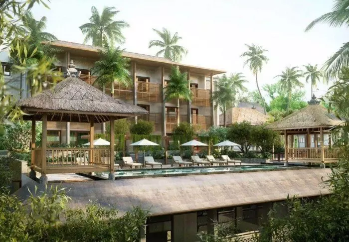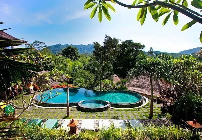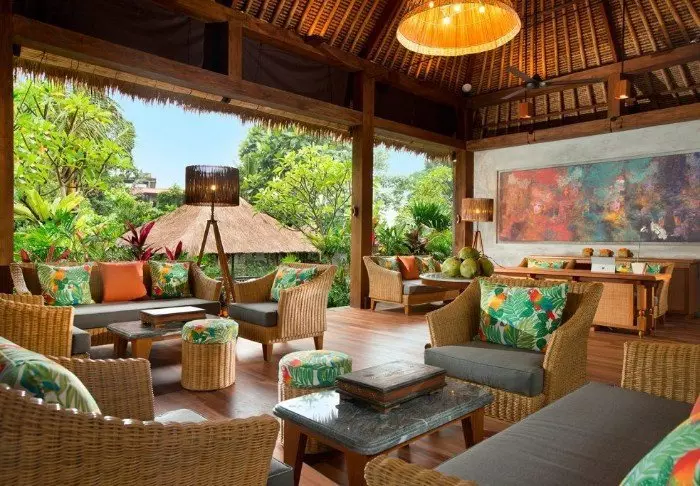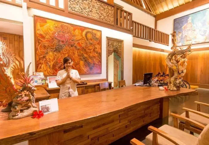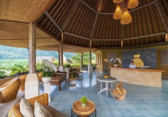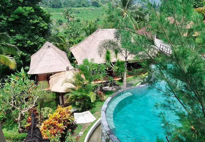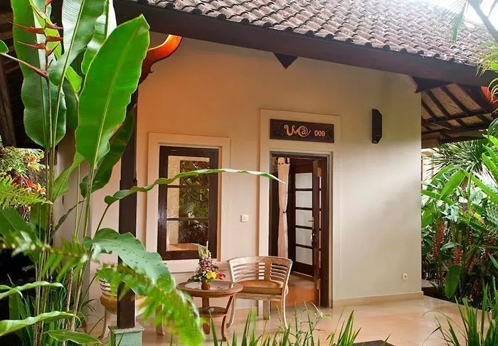 Det lilla hotellet är byggt i traditionell balinesisk stil med naturmaterial som vackert kompletterar de gröna omgivningarna.