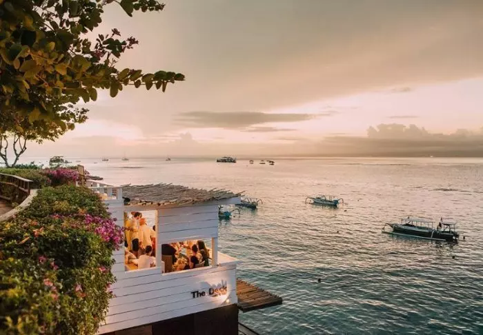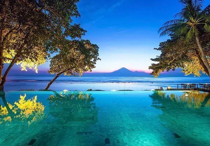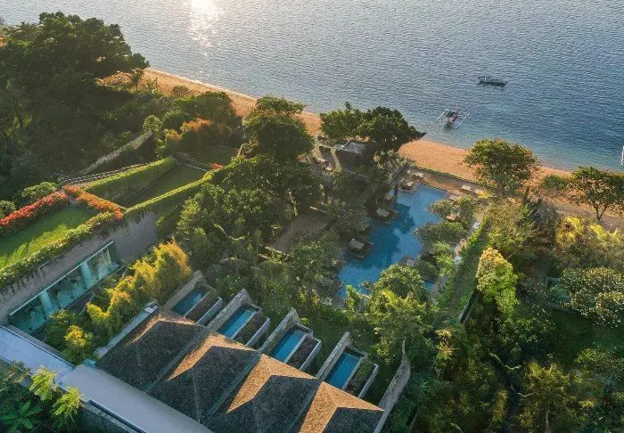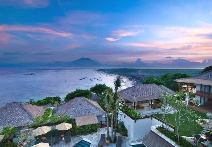 Batu Karang Lembongan Resort ligger på en sluttning över Jungut Batu-stranden med utsikt över Badung-sundet och den storslagna vulkanen Gunung Agung i Bali.