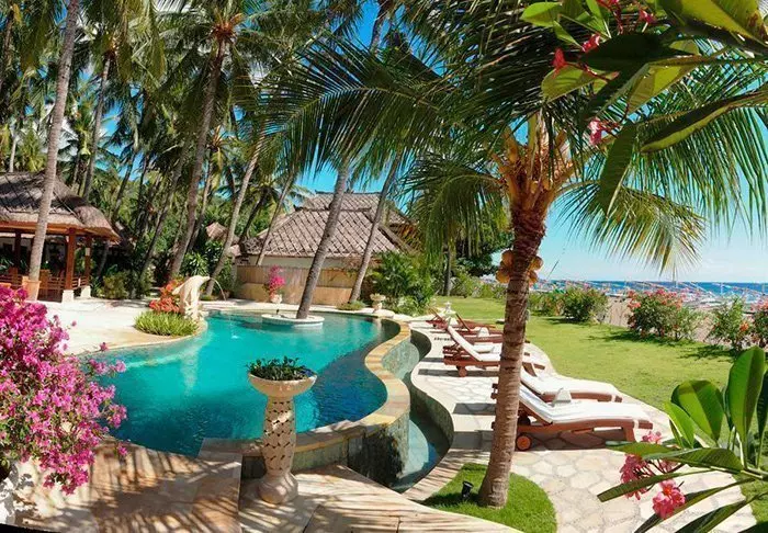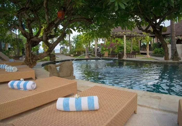 I trädgården ligger hotellets två härliga poolområden. Det ena med tillhörande barnpool och utsikt över stranden och grannön Lombok med berget Rinjani, medan det andra har en vuxenpool som ligger mer avsides, mitt i den tropiska trädgården med palmer och tempelblommor. I båda poolområdena finns parasoller, solstolar och poolbarer, där du kan beställa kalla drycker, färskpressad juice och färskt kokosvatten som serveras i en kokosnöt – ett absolut måste när du är på Gili!