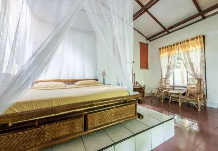 Resorten är liten och intim med enbart elva rum, som ligger fördelade i traditionella bungalower i en frodig trädgård med höga kokospalmer och tropiska träd. Alla rum är utrustade med wifi, aircondition, takfläkt, minibar, värdeskåp, kaffe- och tefaciliteter, makeup-bord och skänk. Sängen är strategiskt placerad vid det stora fönsterpartiet så att du kan njuta av soluppgångens vackra färger på himlen innan du ens har gått upp. Rummen har badrum som ligger delvis utomhus med dusch och hårtork. På terrassen finns det både solstolar och ett trivsamt sittområde.