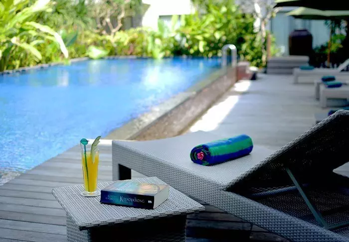 Efter en dag bland vågorna kan du koppla av i hotellets härliga poolområde och njuta av solen med en bra bok.