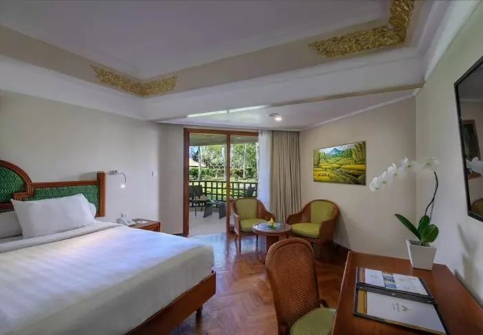 Som standard bor du i ett Wisma Seni Superior-rum, som är resortens nyaste rumstyp. Rummet är elegant inrett i balinesisk stil och omges av grönskande risfält och en organiskt formad pool. Det är ljust och rymligt, med aircondition, TV, värdeskåp och wifi. Den privata balkongen med bord och stolar bjuder in till avkoppling med utsikt över det gröna landskapet. Badrummet är inrett i balinesisk stil med separat toalett, tvättställ och duschhörna.
