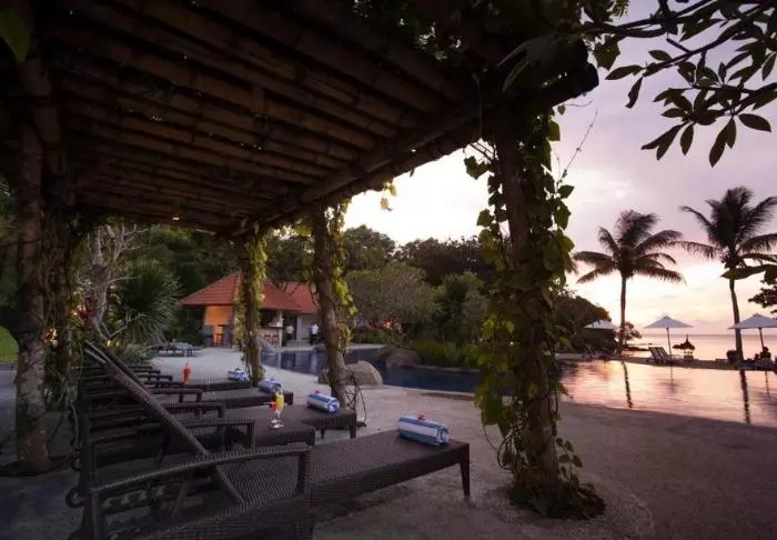 På stranden kan du fritt använda både solstolar och parasoller, så du kan ligga och slappna av och njuta av den indonesiska värmen.