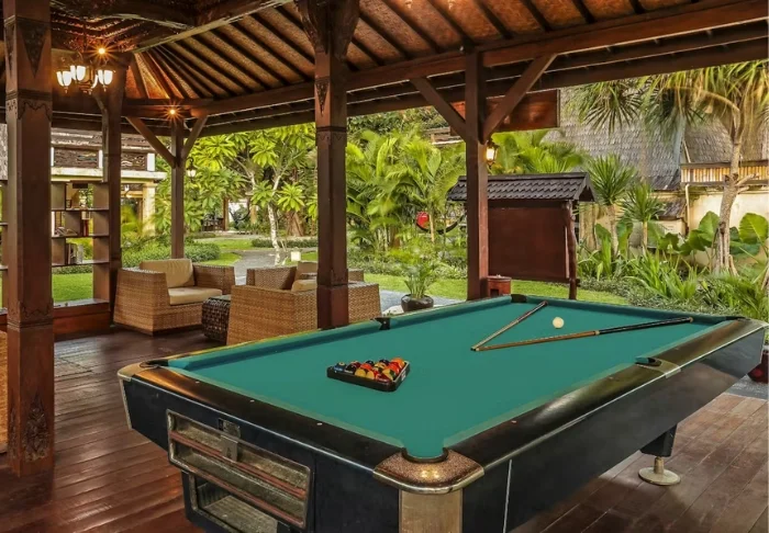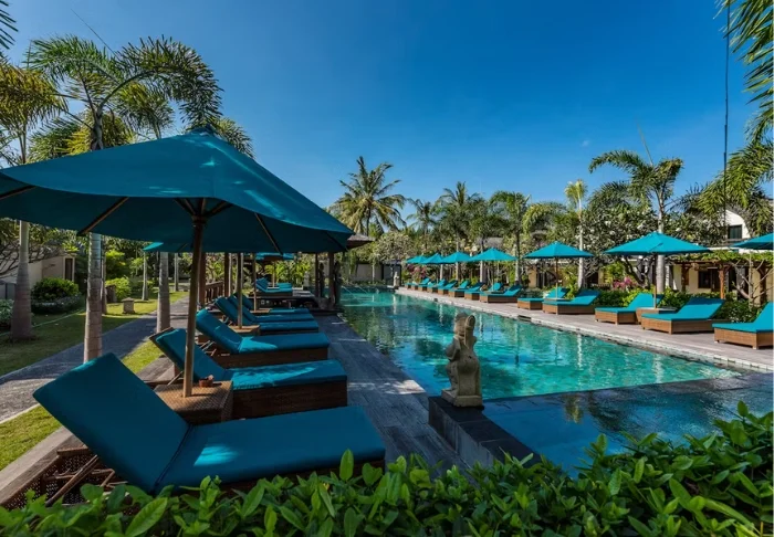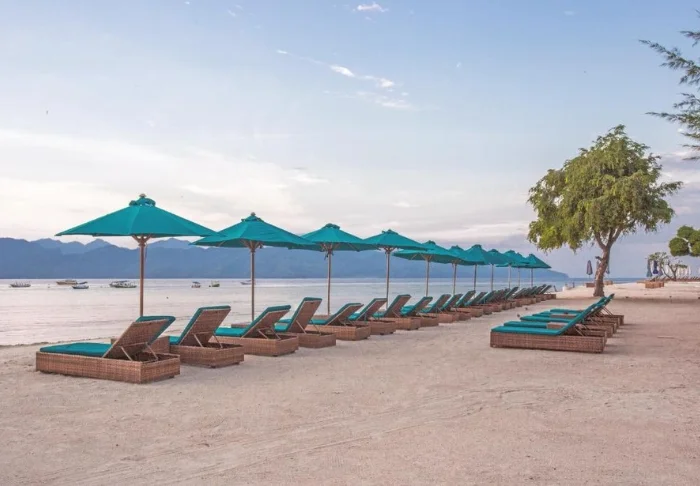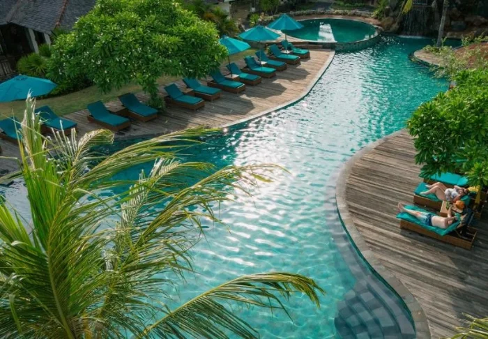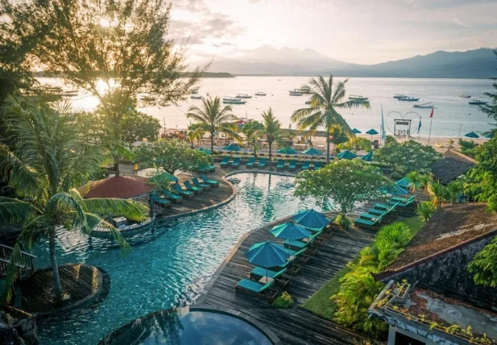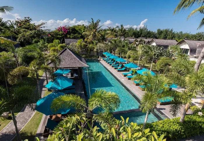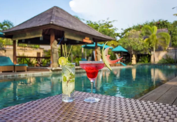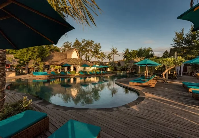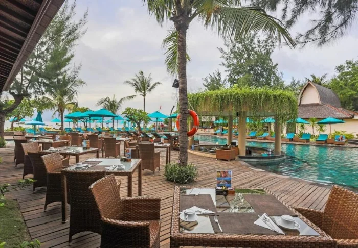 I trädgården ligger hotellets två härliga poolområden. Det ena med tillhörande barnpool och utsikt över stranden och grannön Lombok med berget Rinjani, medan det andra har en vuxenpool som ligger mer avsides, mitt i den tropiska trädgården med palmer och tempelblommor. I båda poolområdena finns parasoller, solstolar och poolbarer, där du kan beställa kalla drycker, färskpressad juice och färskt kokosvatten som serveras i en kokosnöt – ett absolut måste när du är på Gili!
